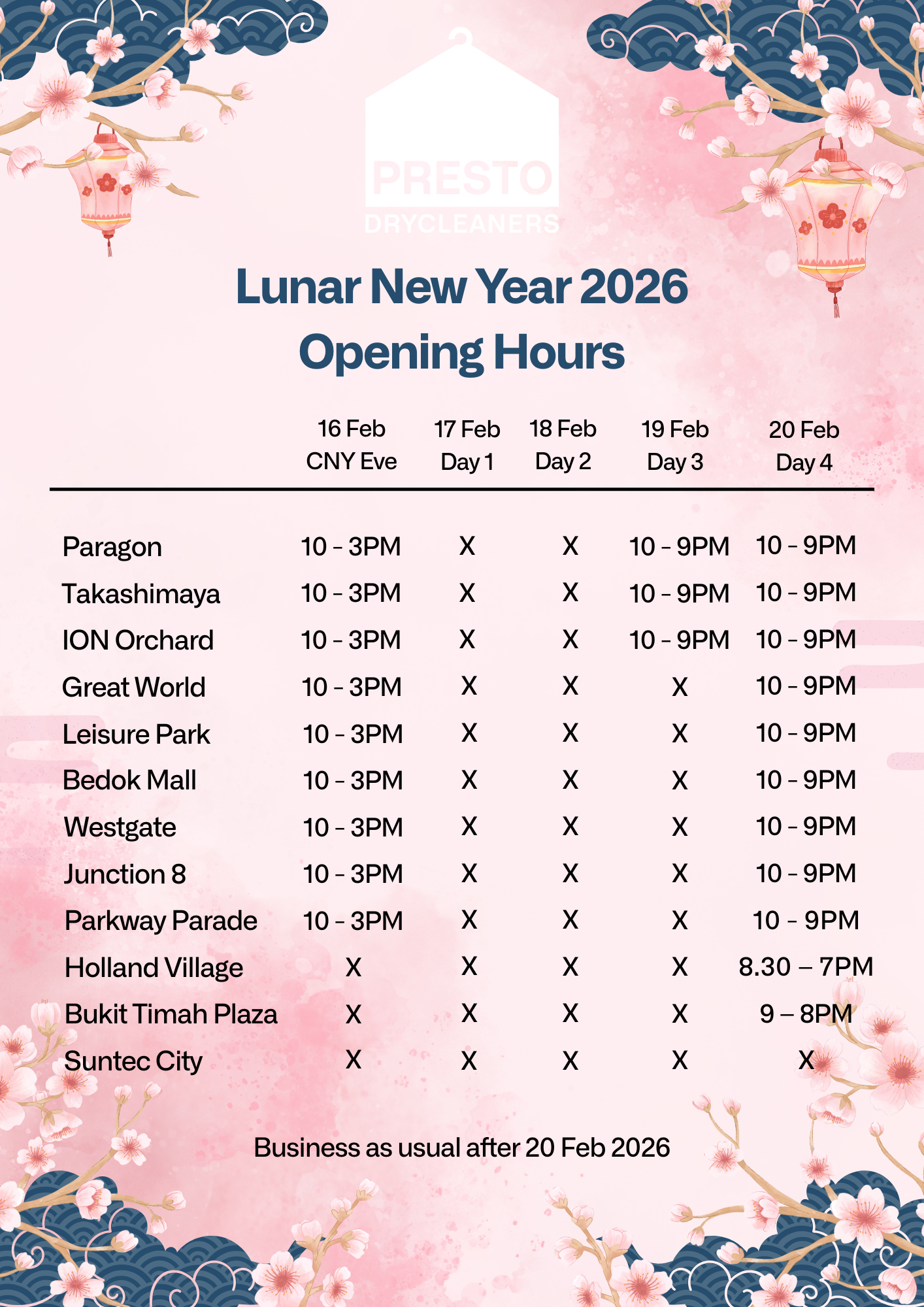 To help you plan ahead during the festive period, please find our Lunar New Year 2026 operating hours for all Presto Drycleaners outlets below: